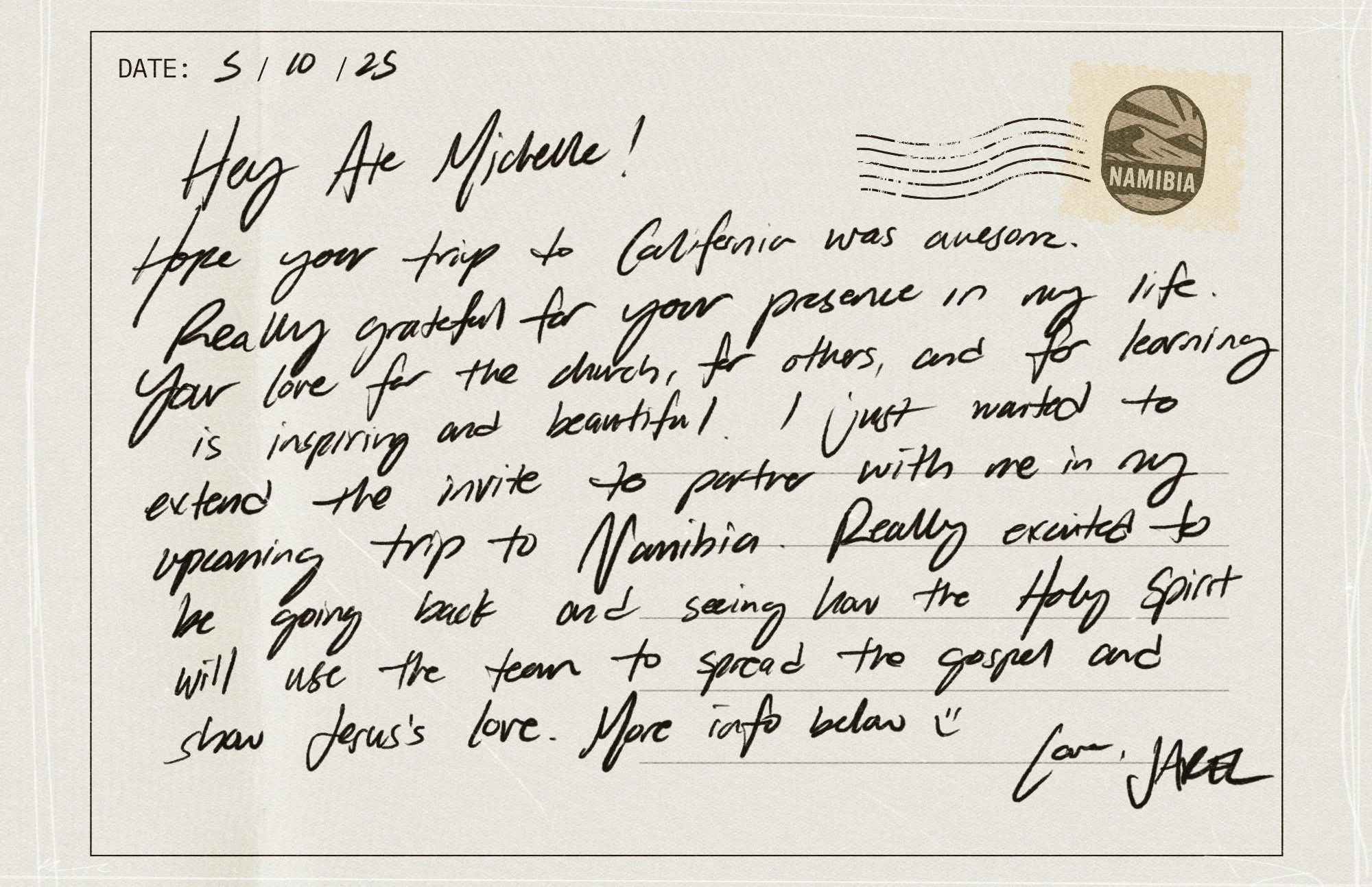 Thank you for being part of this journey. I can’t wait to share what God does in Namibia!