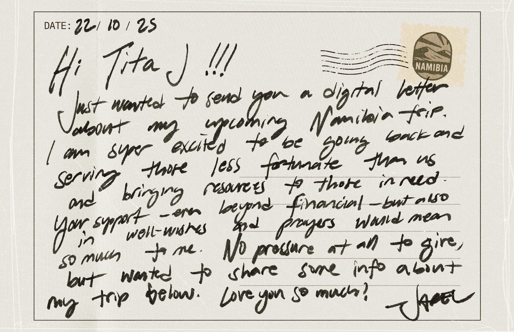 Thank you for being part of this journey. I can’t wait to share what God does in Namibia!